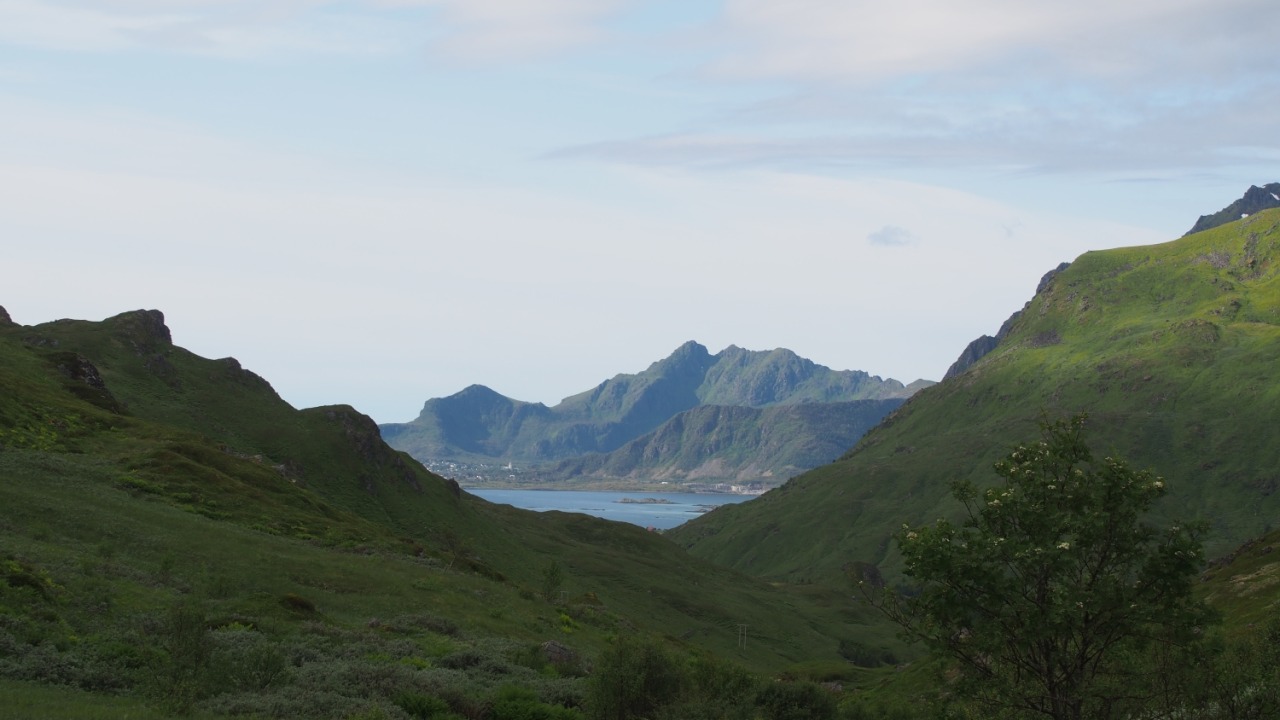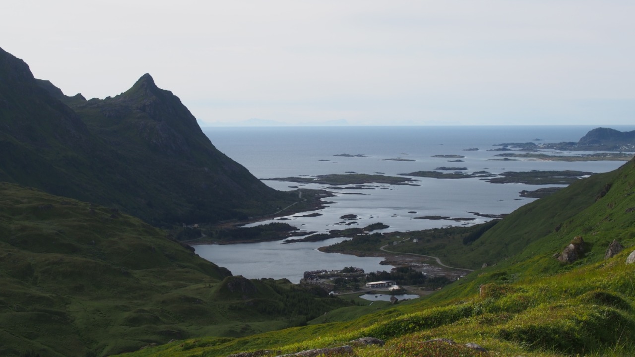 Rapidement, le soleil pointe le bout de son nez pour de bon. Finalement, quelques minutes après le départ, je retire le sur-pantalon et la veste. La pluie semble bien loin… Le ciel bleu fait son apparition. Les voici les Lofoten des cartes postales : les montagnes qui se jettent dans la mer sur fond de ciel bleu, les îles éparpillées un peu partout.