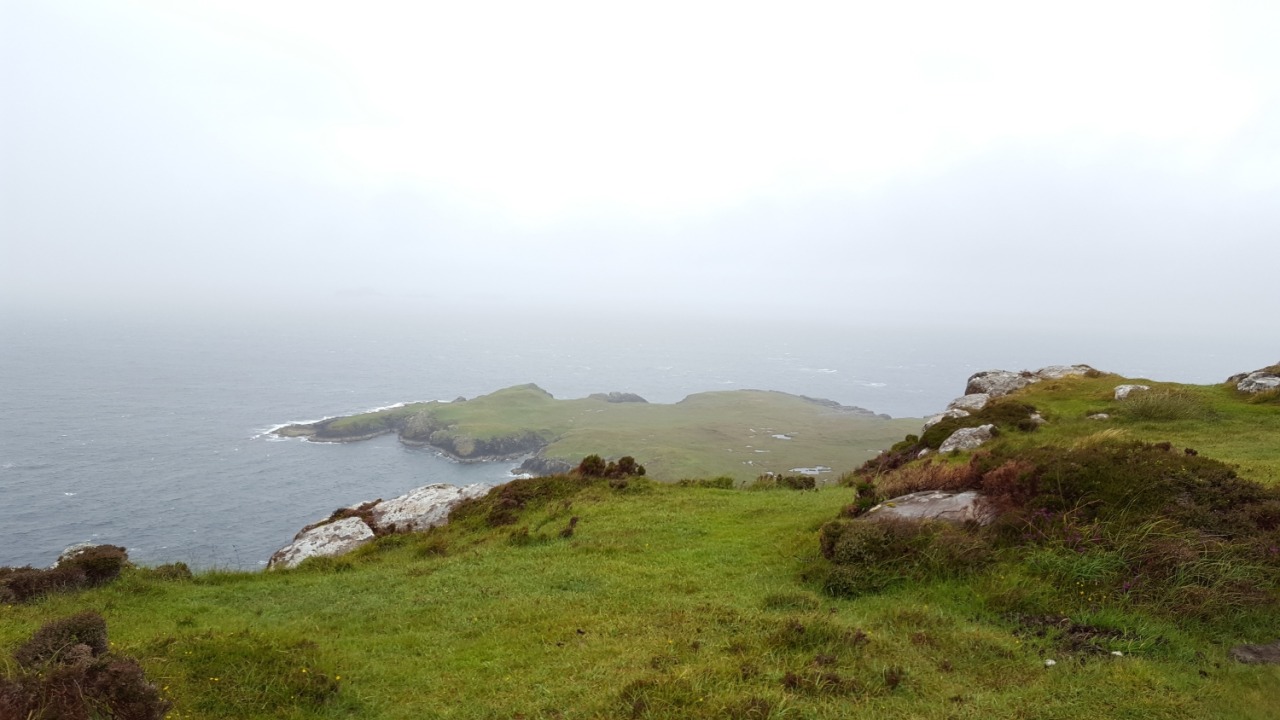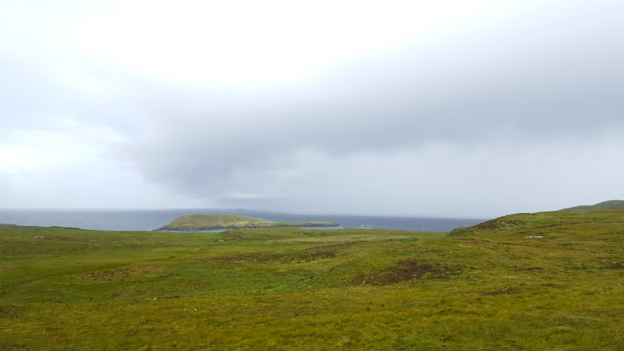 J’arrive à proximité de Rubha Hunish. Il est possible d’aller sur ce bout de terre mais je renonce : avec ce vent et cette pluie, cela n’a aucun intérêt. Et pour la vue sur les Hébrides, c’est râpé aussi : ciel et horizon bouchés !